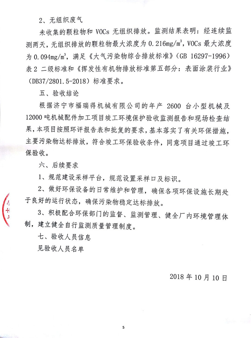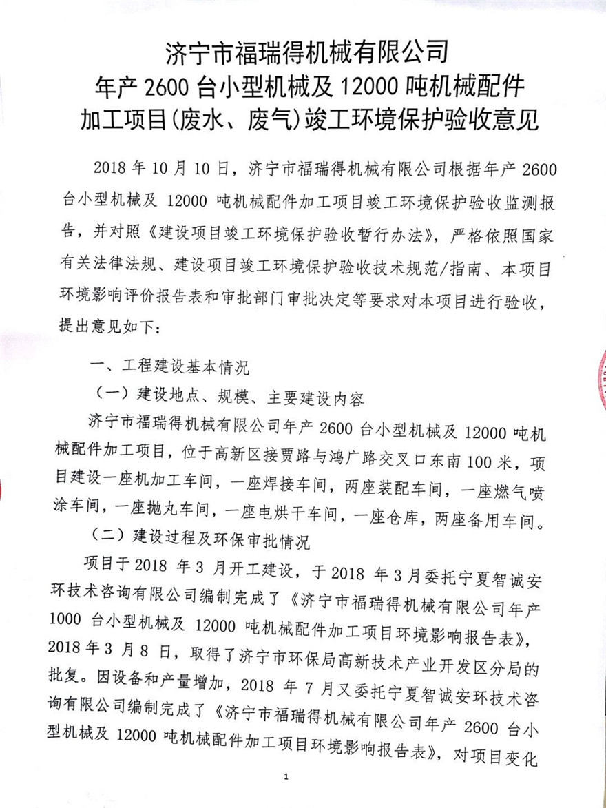 濟(jì)寧市福瑞得機(jī)械有限公司年產(chǎn)2600臺(tái)小型機(jī)械及12000噸機(jī)械配件加工項(xiàng)目(廢氣、廢水)竣工環(huán)境保護(hù)驗(yàn)收意見