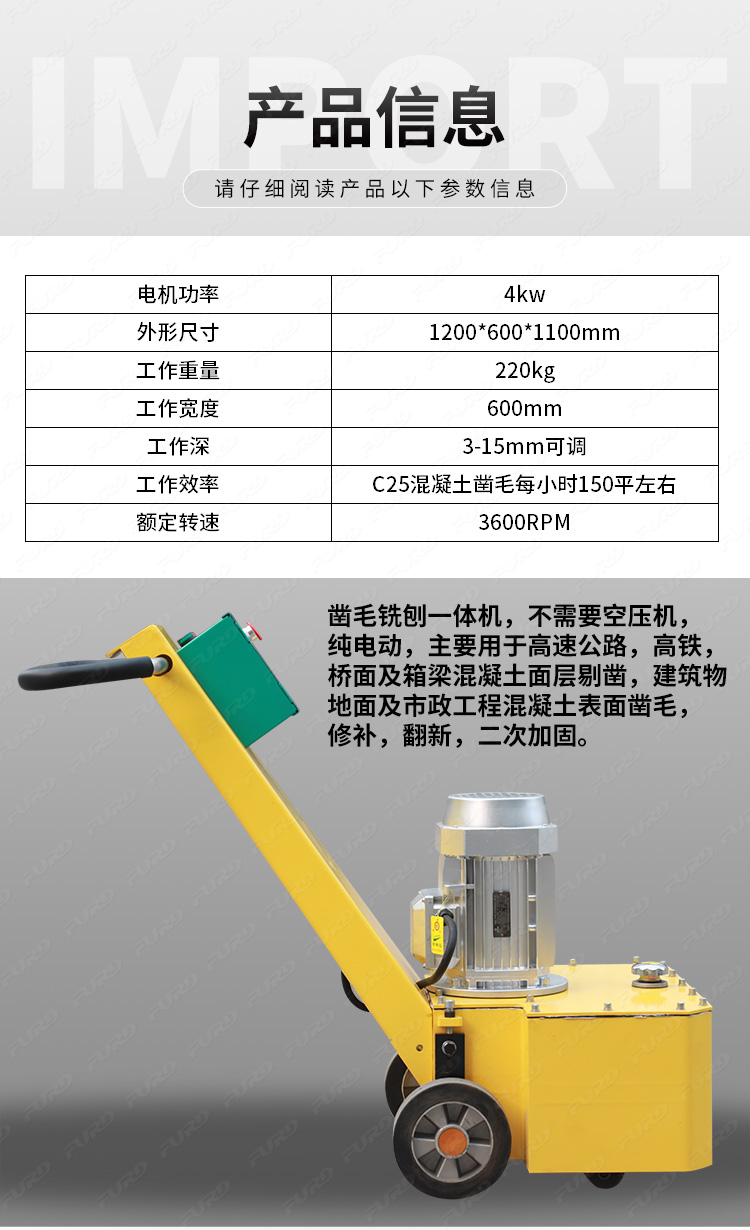 鑿毛銑刨一體機,不需要空壓機,純電動,主要用于高速公路,高鐵,橋面及箱梁混凝土面層剔鑿,建筑物地面及市政工程混凝土表面鑿毛,修補,翻新,二次加固。