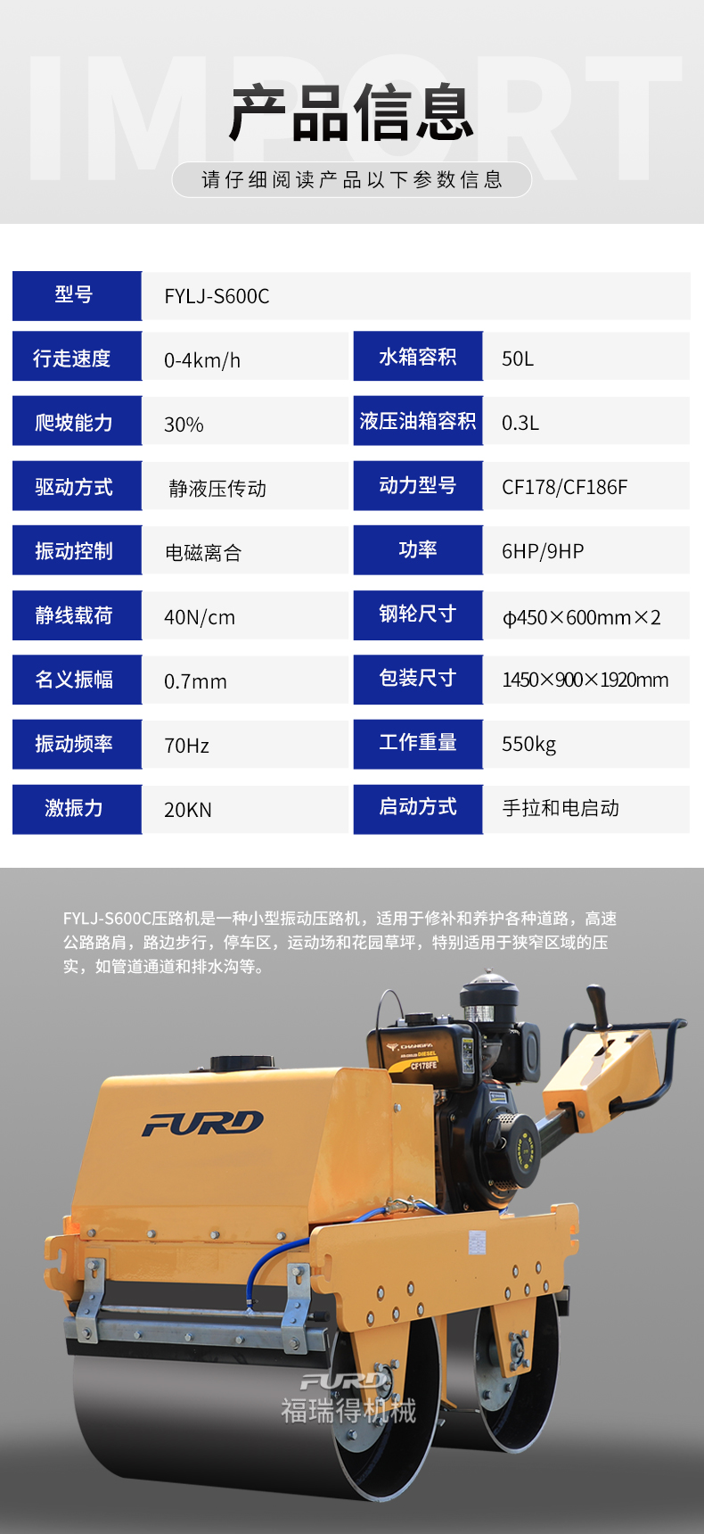 FYLJ-S600C 靜液壓小型手扶雙輪壓路機