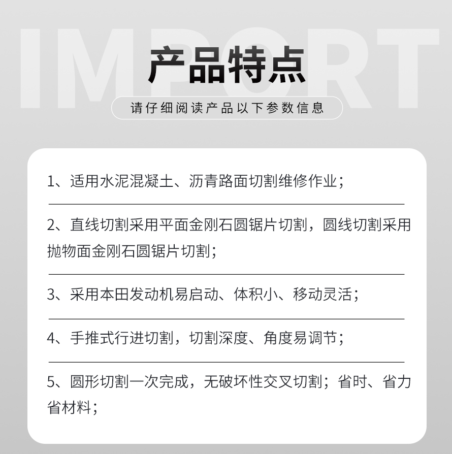井周切縫機(jī)適合水泥混泥土、瀝青路面切割維修;既可以做直線(xiàn)路面切縫機(jī)使用,也可以做圓形路面切縫機(jī);獨(dú)特的圓形切割能力省去了普通切縫機(jī)多次交叉破壞性切割的麻煩,效率是普通切縫機(jī)的10倍以上。