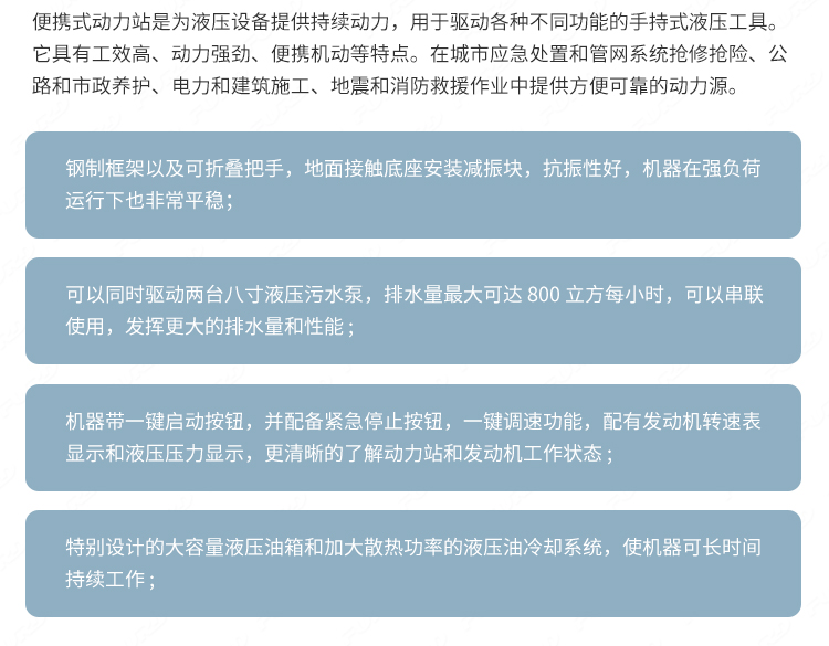 適用于路面搶修、道路施工、市政維護(hù)、保養(yǎng)、園林等工作場景 ;.設(shè)備安裝便捷,搬運(yùn)簡便,適應(yīng)性強(qiáng),可輕松解決破碎、切削、分裂、打樁、壓實(shí)等施工項目。